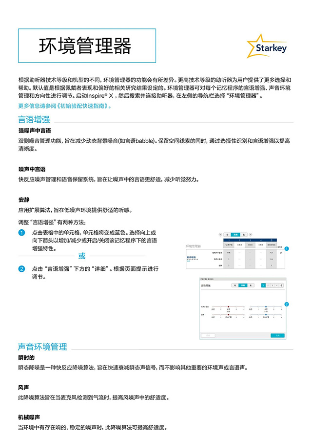 根据助听器技术等级和机型的不同,环境管理器的功能会有所差异。更高技术等级的助听器为用户提供了更多选择和帮助。默认值是根据佩戴者表现和偏好的相关研究结果设定的。环境管理器可对每个记忆程序的言语增强、声音环境管理和方向性进行调节。启动Inspire X ,然后搜索并连接助听器,在左侧的导航栏选择“环境管理器”。